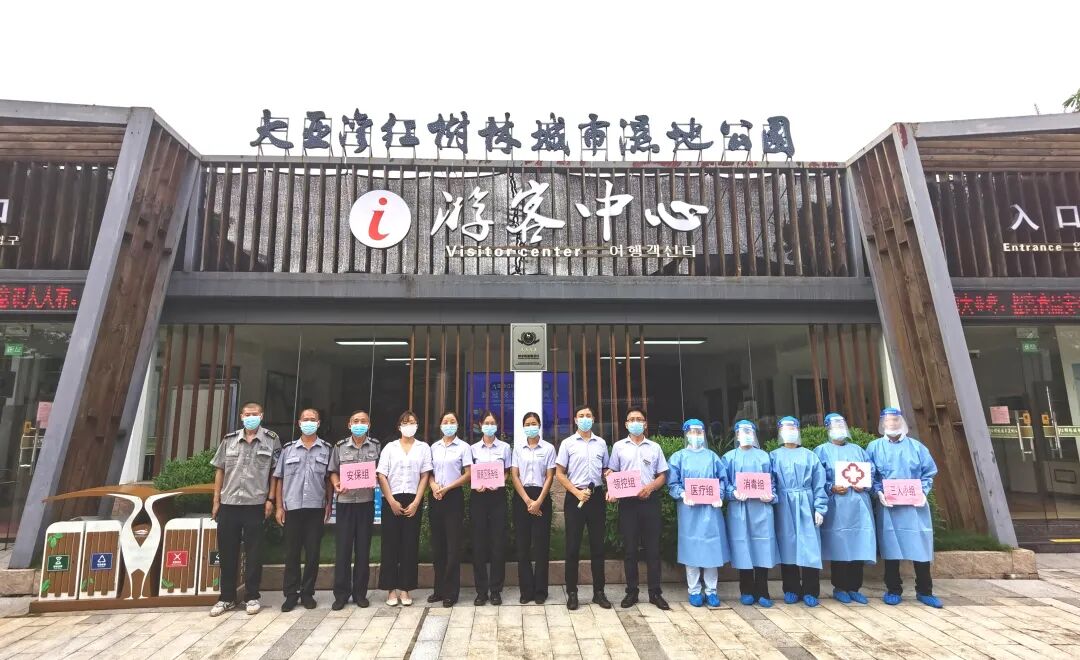 8月31日下午15点,在大亚湾红树林城市湿地公园游客中心开展了疫情防控应急演练,景区全体工作人员积极响应参加。此次演练由领控组、安保组、医疗组、隔离区服务组、消毒组、三人小组6个小组组成。